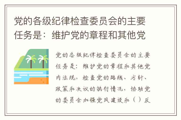党的各级纪律检查委员会在反腐败工作中承担的是组织协调职责,这一表述明确写入《中国共产党章程》第四十六条。党章规定纪委的三大主要任务包括“维护党的章程和其他党内法规”“检查党的路线、方针、政策和决议的执行情况”,以及“协助党的委员会推进全面从严治党、加强党风建设和组织协调反腐败工作”。这一职责定位体现了纪委在反腐败工作中的枢纽作用——既非替代党委决策,也非包揽具体执行,而是通过统筹协调形成反腐合力。