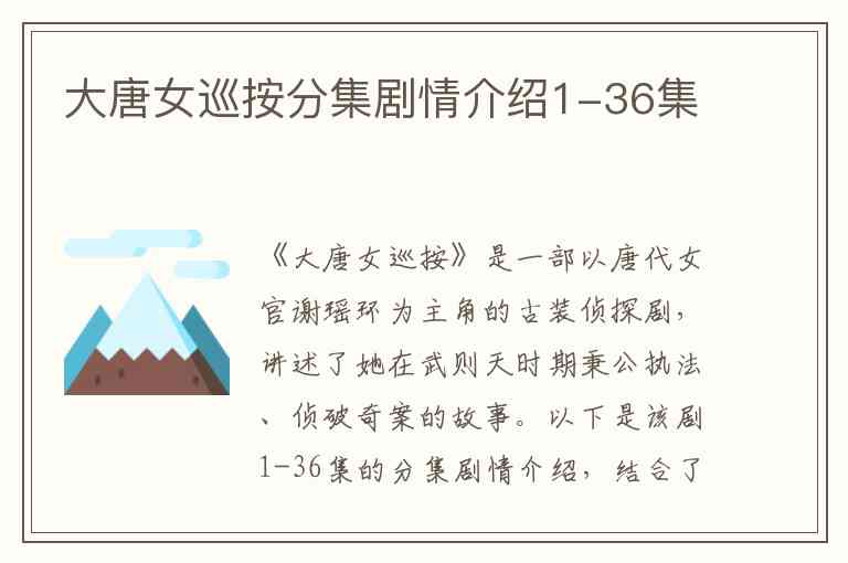 《大唐女巡按》是一部以唐代女官谢瑶环为主角的古装侦探剧,讲述了她在武则天时期秉公执法、侦破奇案的故事。以下是该剧1-36集的分集剧情介绍,结合了多个来源的细节整理: