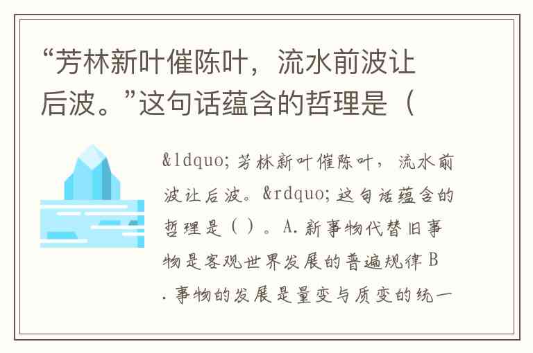 “芳林新叶催陈叶,流水前波让后波。”这句话蕴含的哲理是()。A.新事物代替旧事物是客观世界发展的普遍规律 B.事物的发展是量变与质变的统一 C.事物发展的曲折性是不可避免的 D.事物发展是前进性和曲折性的统一