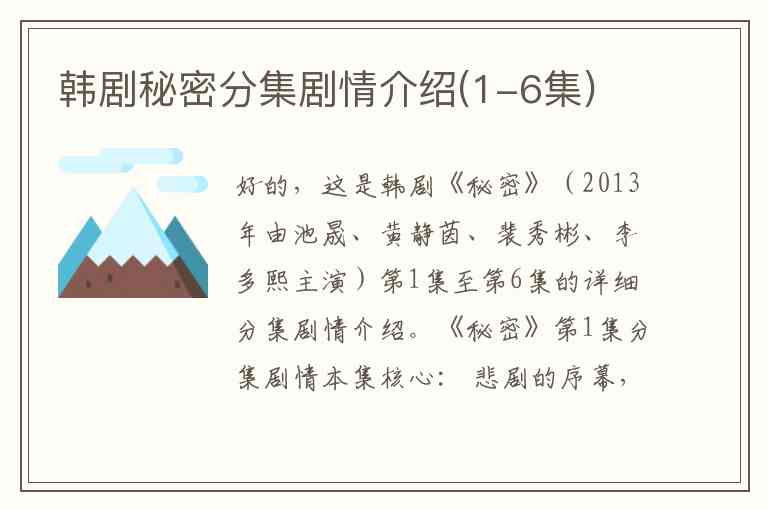 希望这份详细的分集剧情能帮助您更好地了解《秘密》前六集的故事发展。这部剧以其强烈的戏剧冲突、演员精湛的演技和“虐恋”情节著称,从最初的仇恨到逐渐理解与深爱,过程扣人心弦。