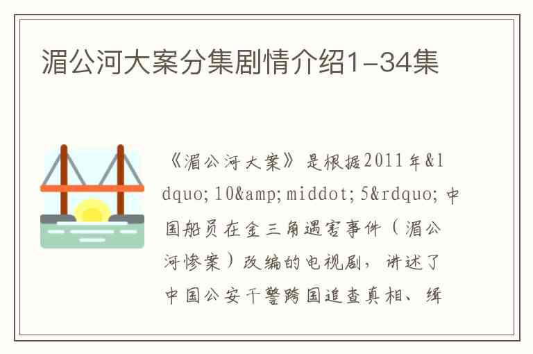《湄公河大案》是根据2011年“10·5”中国船员在金三角遇害事件(湄公河惨案)改编的电视剧,讲述了中国公安干警跨国追查真相、缉拿真凶的故事。以下是1-34集的分集剧情介绍: