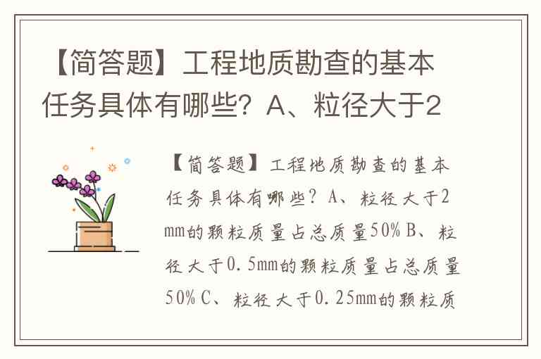 【简答题】工程地质勘查的基本任务具体有哪些?A、粒径大于2mm的颗粒质量占总质量50% B、粒径大于0.5mm的颗粒质量占总质量50% C、粒径大于0.25mm的颗粒质量占总质量50% D、粒径大于0.25mm的颗粒质量占总质量25-50%