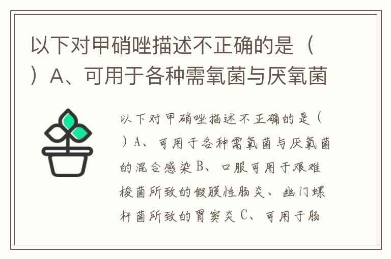 以下对甲硝唑描述不正确的是()A、可用于各种需氧菌与厌氧菌的混合感染 B、口服可用于艰难梭菌所致的假膜性肠炎、幽门螺杆菌所致的胃窦炎 C、可用于肠道及肠外阿米巴病、阴道滴虫病 D、可用于铜绿假单胞菌所致的感染