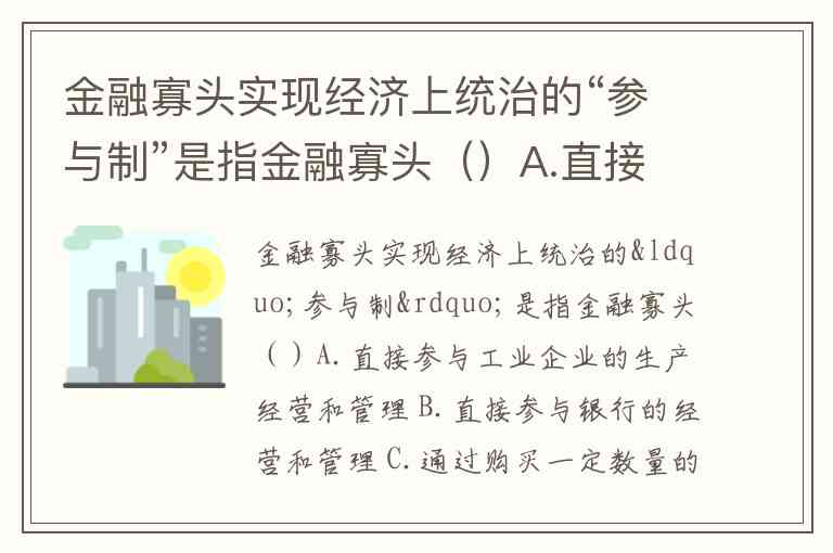 金融寡头实现经济上统治的“参与制”是指金融寡头()A.直接参与工业企业的生产经营和管理 B.直接参与银行的经营和管理 C.通过购买一定数量的股票层层控制许多大企业和大银行的经济统治方式 D.通过购买所属公司全部股票直接掌握许多大企业和大银行的经济统治方式