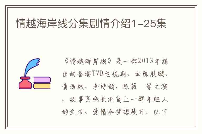 《情越海岸线》是一部2013年播出的香港TVB电视剧,由陈展鹏、黄浩然、李诗韵、陈茵媺等主演。故事围绕长洲岛上一群年轻人的生活、爱情和梦想展开。以下是第1集至第25集的详细分集剧情介绍: