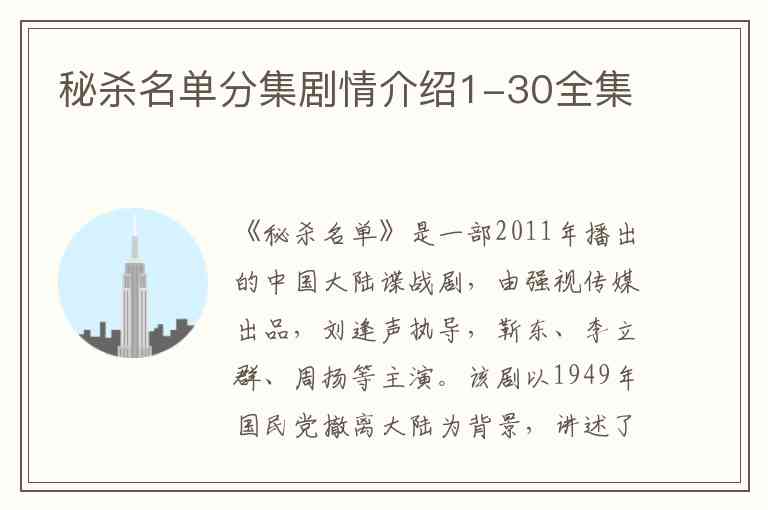 《秘杀名单》是一部2011年播出的中国大陆谍战剧,由强视传媒出品,刘逢声执导,靳东、李立群、周扬等主演。该剧以1949年国民党撤离大陆为背景,讲述了国民党政府制定了一份“秘杀名单”,上面包括众多爱国民主人士,而我党地下工作者则肩负着保护这些人士、夺取名单的重任。