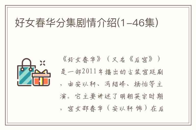 《好女春华》(又名《后宫》)是一部2011年播出的古装宫廷剧,由安以轩、冯绍峰、杨怡等主演。它主要讲述了明朝英宗时期,宫女邵春华(安以轩 饰)在后宫中的坎坷经历以及与乐工杨永(冯绍峰 饰)之间的真挚爱情。