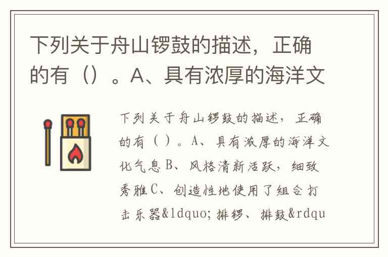 选项B中“细致秀雅”的风格描述与实际不符,舟山锣鼓的特点是“音响宏壮,旋律急荡奔放”;选项D提到的“五小锣,四大锣”并非其特色,排锣与排鼓才是标志性组合。这一艺术形式不仅入选国家级非物质文化遗产名录,更通过《渔舟凯歌》《东海渔歌》等经典曲目,成为传递海洋文化的重要符号。