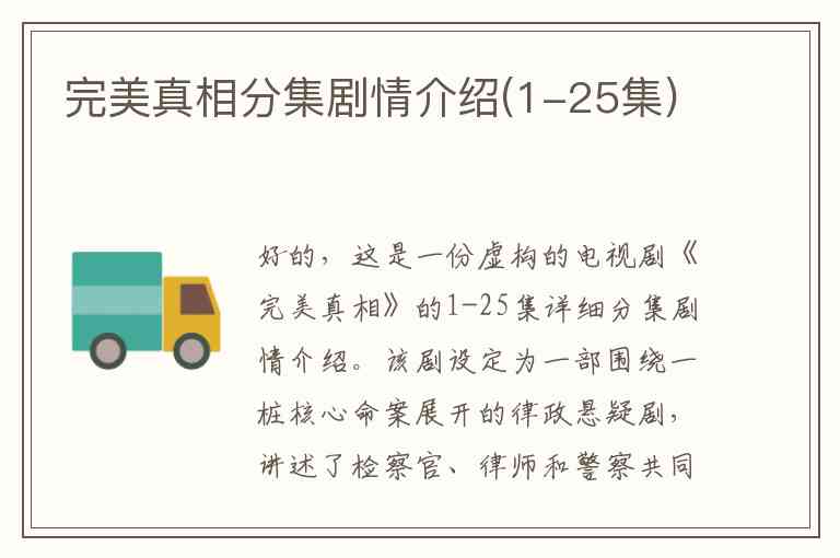好的,这是一份虚构的电视剧《完美真相》的1-25集详细分集剧情介绍。该剧设定为一部围绕一桩核心命案展开的律政悬疑剧,讲述了检察官、律师和警察共同追寻真相的故事。