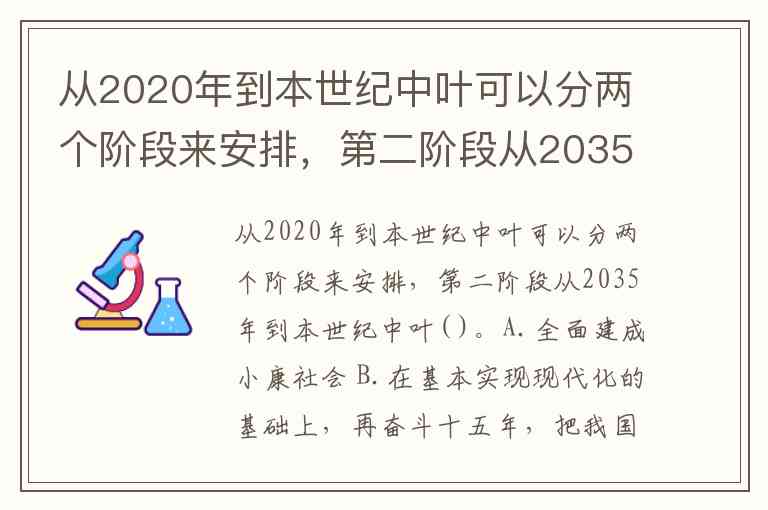从2020年到本世纪中叶可以分两个阶段来安排,第二阶段从2035年到本世纪中叶( )。A.全面建成小康社会 B.在基本实现现代化的基础上,再奋斗十五年,把我国建设成为富强民主文明和谐的社会主义现代化强国 C.在基本实现现代化的基础上,再奋斗五十年,把我国建设成为富强民主文明和谐美丽的社会主义现代化强国 D.在基本实现现代化的基础上,再奋斗十五年,把我国建设成为富强民主文明和谐美丽的社会主义现代化强国