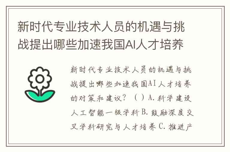 新时代专业技术人员的机遇与挑战提出哪些加速我国AI人才培养的对策和建议?()A.科学建设人工智能一级学科 B.鼓励深度交叉学科研究与人才培养 C.推进产学研合作的新培养模式 D.鼓励精准引进一流人工智能人才 E.鼓励中国学术海外留学就业