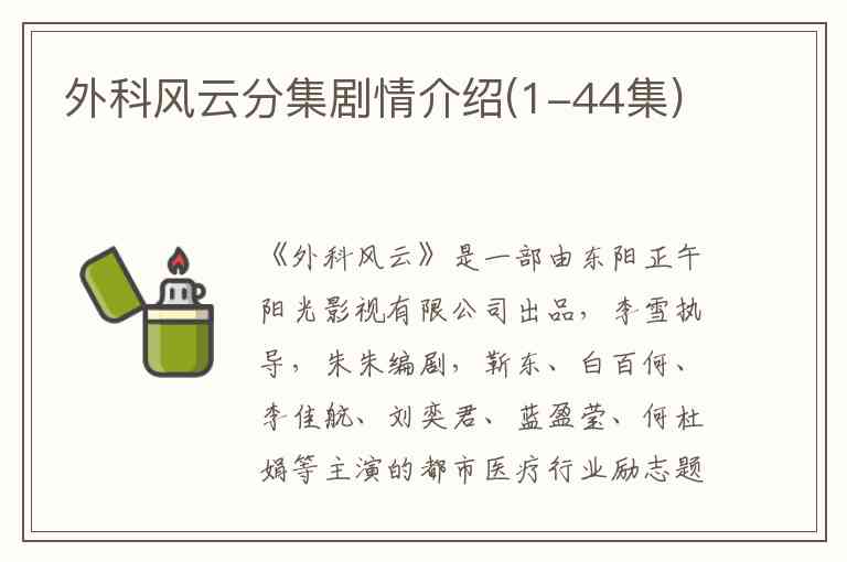 《外科风云》是一部由东阳正午阳光影视有限公司出品,李雪执导,朱朱编剧,靳东、白百何、李佳航、刘奕君、蓝盈莹、何杜娟等主演的都市医疗行业励志题材电视剧。全剧共44集,以下是为您整理的详细分集剧情介绍: