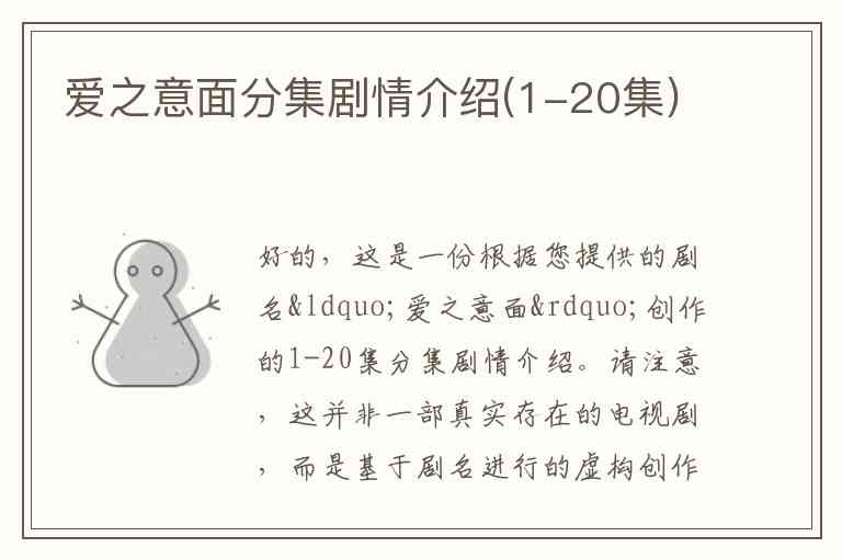好的,这是一份根据您提供的剧名“爱之意面”创作的1-20集分集剧情介绍。请注意,这并非一部真实存在的电视剧,而是基于剧名进行的虚构创作,融合了美食、爱情、职场和家庭等元素。
