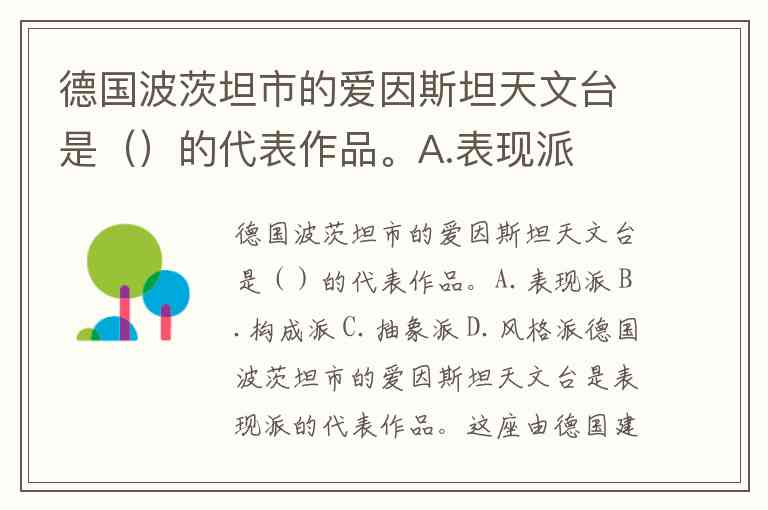 德国波茨坦市的爱因斯坦天文台是()的代表作品。A.表现派 B.构成派 C.抽象派 D.风格派