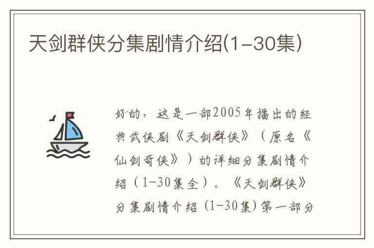 好的,这是一部2005年播出的经典武侠剧《天剑群侠》(原名《仙剑奇侠》)的详细分集剧情介绍(1-30集全)。