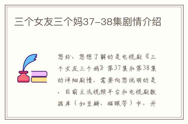 您好,您想了解的是电视剧《三个女友三个妈》第37集和第38集的详细剧情。需要向您说明的是,目前主流视频平台和电视剧数据库(如豆瓣、猫眼等)中,并没有找到一部官方译名为《三个女友三个妈》且剧情完全对应的电视剧。