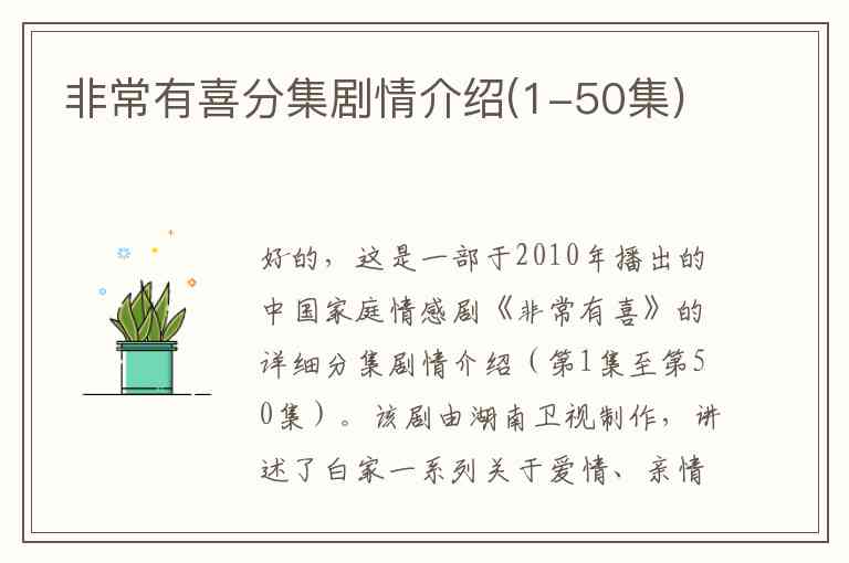 好的,这是一部于2010年播出的中国家庭情感剧《非常有喜》的详细分集剧情介绍(第1集至第50集)。该剧由湖南卫视制作,讲述了白家一系列关于爱情、亲情和成长的温馨故事。