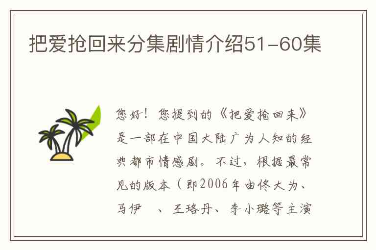 您好!您提到的《把爱抢回来》是一部在中国大陆广为人知的经典都市情感剧。不过,根据最常见的版本(即2006年由佟大为、马伊琍、王珞丹、李小璐等主演的电视剧),这部剧通常名为《奋斗》,全集为32集。