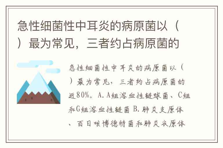 急性细菌性中耳炎的病原菌以()最为常见,三者约占病原菌的近80%。A.A组溶血性链球菌、C组和G组溶血性链菌 B.肺炎支原体、百日咳博德特菌和肺炎衣原体 C.肺炎链球菌、流感嗜血杆菌和卡他莫拉菌 D.铜绿假单胞菌、卡他莫拉菌和肺炎衣原体