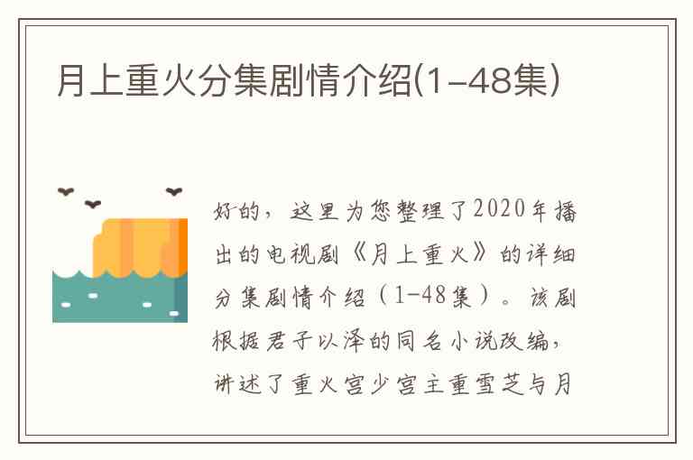 好的,这里为您整理了2020年播出的电视剧《月上重火》的详细分集剧情介绍(1-48集)。