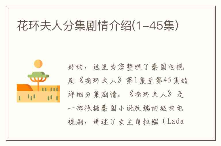 好的,这里为您整理了泰国电视剧《花环夫人》第1集至第45集的详细分集剧情。