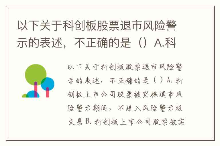 以下关于科创板股票退市风险警示的表述,不正确的是()A.科创板上市公司股票被实施退市风险警示期间,不进入风险警示板交易 B.科创板上市公司股票被实施退市风险警示期间,不适用风险警示板交易的相关规定 C.科创板上市公司股票被实施退市风险警示的,在公司股票简称前冠以“*ST”字样 D.科创板上市公司股票不实施退市风险警示