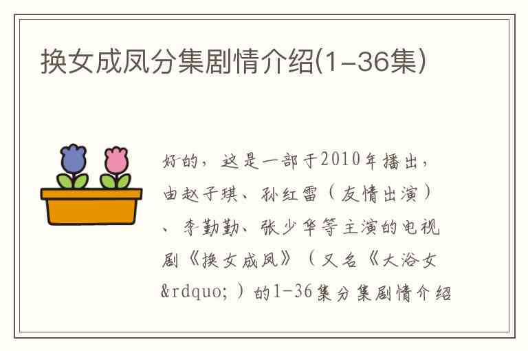 好的,这是一部于2010年播出,由赵子琪、孙红雷(友情出演)、李勤勤、张少华等主演的电视剧《换女成凤》(又名《大浴女”)的1-36集分集剧情介绍。