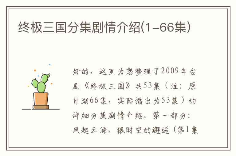 好的,这里为您整理了2009年台剧《终极三国》共53集(注:原计划66集,实际播出为53集)的详细分集剧情介绍。