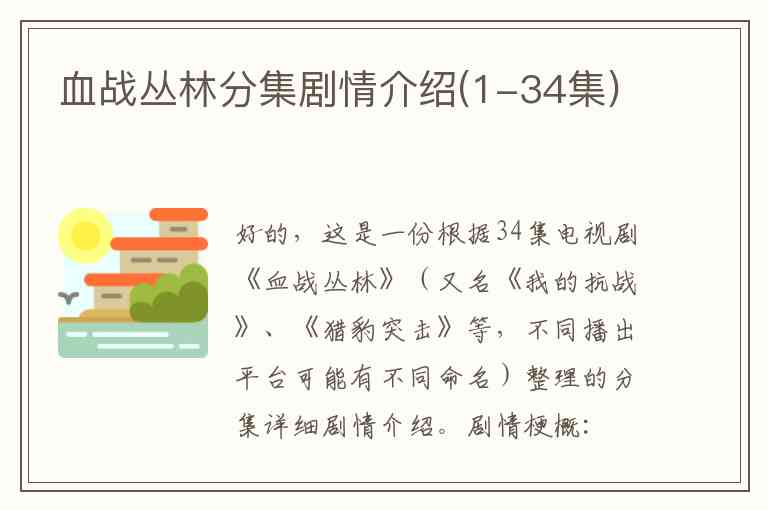 好的,这是一份根据34集电视剧《血战丛林》(又名《我的抗战》、《猎豹突击》等,不同播出平台可能有不同命名)整理的分集详细剧情介绍。