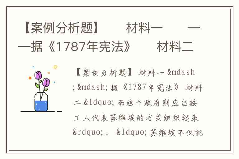【案例分析题】 材料一 ——据《1787年宪法》 材料二 “而这个政府则应当按工人代表苏维埃的方式组织起来”。 “苏维埃不仅把立法权和对执行法律的监督权集中在自己的手里,而且通过苏维埃全体委员把直接执行法律的职能集中在自己的手里,以便逐步过渡到全体劳动居民人人履行立法和管理国家的职能。” ——摘自《列宁选集》 材料三 “人民行使国家权力的机关是全国人民代表大会和地方各级人民代表大会。” “全国人民代表大会和地方各级人民代表大会都由民主选举产生,对人民负责,受人民监督。 国家行政机关、审判机关、检察机关都由人民代表大会产生,对它负责,受它监督。 中央和地方的国家机构职权的划分,遵循在中央的统一领导下,充分发挥地方的主动性、积极性的原则。” ——摘自1982年《中华人民共和国宪法》 根据材料二并结合所学知识概括苏维埃俄国政体的特点。