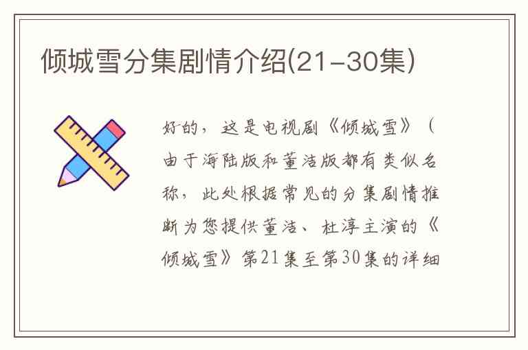 好的,这是电视剧《倾城雪》(由于海陆版和董洁版都有类似名称,此处根据常见的分集剧情推断为您提供董洁、杜淳主演的《倾城雪》第21集至第30集的详细分集剧情介绍。
