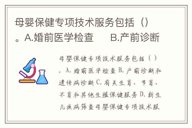 母婴保健专项技术服务涵盖婚前、孕产期至产后的全链条健康保障,根据《中华人民共和国母婴保健法实施办法》,具体包括七类核心服务事项。其中,婚前医学检查(A项)作为第一道健康筛查,通过专业检查评估婚姻双方健康状况,预防遗传性疾病传播;产前诊断和遗传病诊断(B项)则聚焦胎儿健康,通过基因检测等技术手段识别先天缺陷,为优生优育提供科学依据。新生儿疾病筛查(D项)作为产后关键环节,通过足跟血采集等方式早期发现苯丙酮尿症等遗传代谢性疾病,实现早干预早治疗。