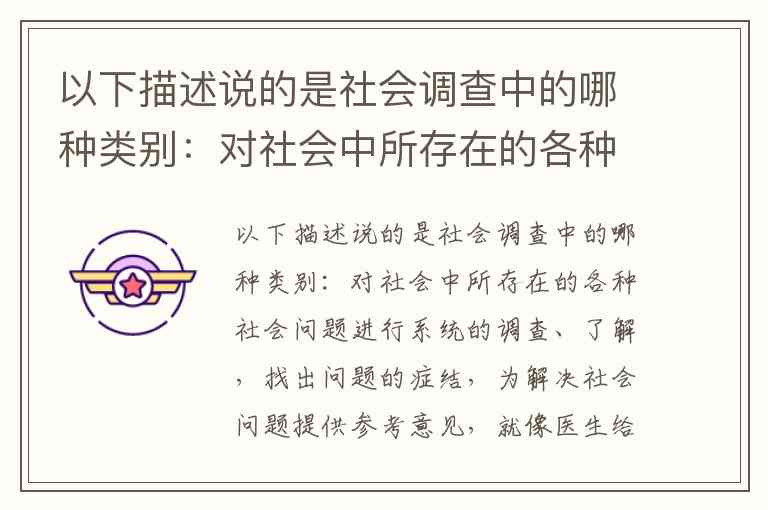 以下描述说的是社会调查中的哪种类别:对社会中所存在的各种社会问题进行系统的调查、了解,找出问题的症结,为解决社会问题提供参考意见,就像医生给病人看病一样,对各种社会问题进行“社会诊断”。()A.生活状况调查 B.社会问题调查 C.民意调查 D.市场调查
