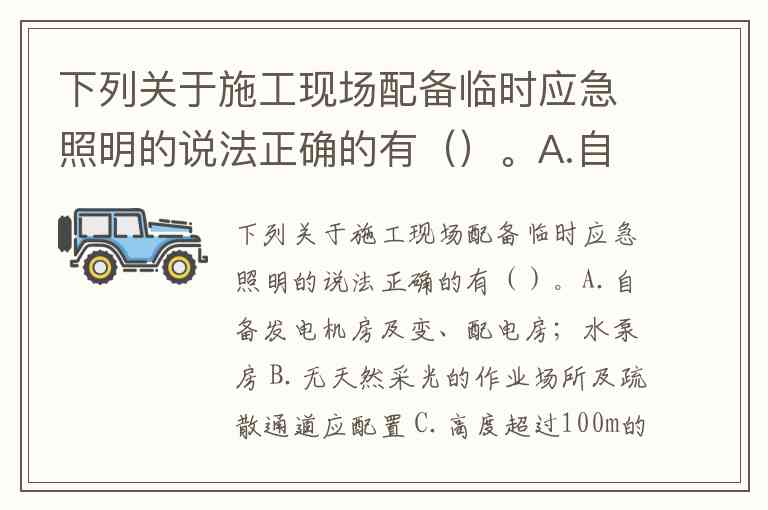下列关于施工现场配备临时应急照明的说法正确的有()。A.自备发电机房及变、配电房;水泵房 B.无天然采光的作业场所及疏散通道应配置 C.高度超过100m的在建工程的室内疏散通道 D.电梯井口 E.发生火灾时仍需坚持工作的其他场所
