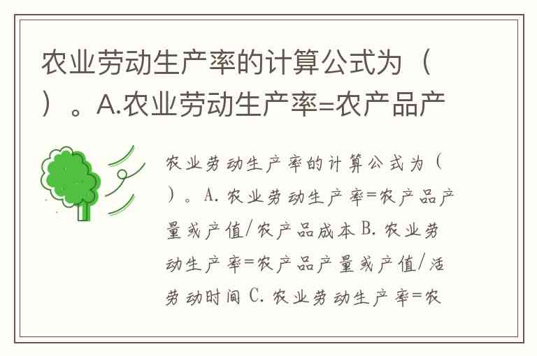 农业劳动生产率的计算公式为()。A.农业劳动生产率=农产品产量或产值/农产品成本 B.农业劳动生产率=农产品产量或产值/活劳动时间 C.农业劳动生产率=农产品成本/物化劳动时间 D.农业劳动生产率=活劳动时间/活劳动时间+物化劳动时间