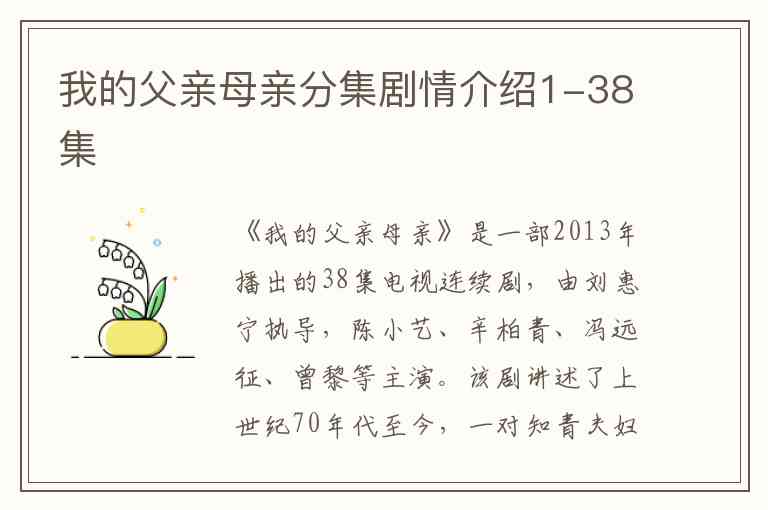 《我的父亲母亲》是一部2013年播出的38集电视连续剧,由刘惠宁执导,陈小艺、辛柏青、冯远征、曾黎等主演。该剧讲述了上世纪70年代至今,一对知青夫妇跨越几十年的婚姻爱情故事,展现了时代变迁下普通人的情感与生活。