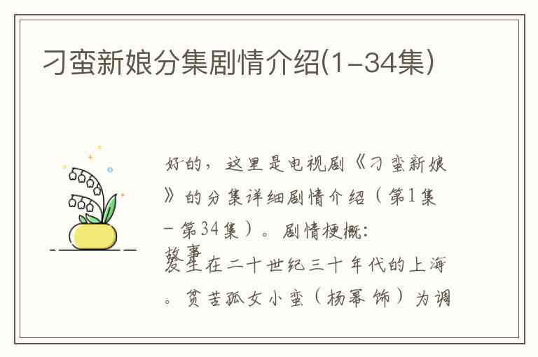 好的,这里是电视剧《刁蛮新娘》的分集详细剧情介绍(第1集 - 第34集)。