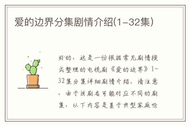 好的,这是一份根据常见剧情模式整理的电视剧《爱的边界》1-32集分集详细剧情介绍。请注意,由于该剧名可能对应不同的剧集,以下内容是基于典型家庭伦理、情感纠葛题材创作的一个综合性剧情梗概。