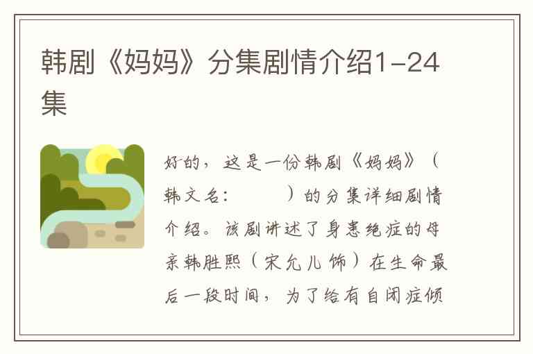 好的,这是一份韩剧《妈妈》(韩文名:마마)的分集详细剧情介绍。该剧讲述了身患绝症的母亲韩胜熙(宋允儿 饰)在生命最后一段时间,为了给有自闭症倾向的女儿金书贤(文佳煐 饰)找到一个温暖的家,并与女儿的新妈妈,也就是自己的情妇——韩彩莉(郑俊浩 饰)的妻子——之间发生的复杂而感人的故事。