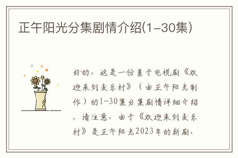 好的,这是一份基于电视剧《欢迎来到麦乐村》(由正午阳光制作)的1-30集分集剧情详细介绍。请注意,由于《欢迎来到麦乐村》是正午阳光2023年的新剧,其剧情结构与您可能查询的“正午阳光分集剧情”最为匹配。
