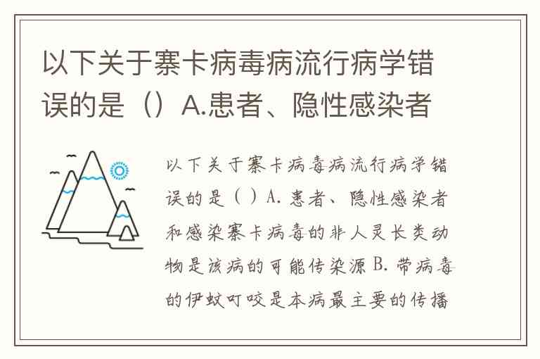 核心错误点:选项C将主要传播媒介表述为“非洲伊蚊”,但权威资料明确显示,寨卡病毒的主要传播媒介为埃及伊蚊,而非非洲伊蚊。非洲伊蚊仅属于“可能传播该病毒”的次要媒介之一。