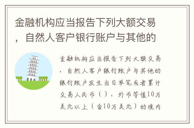金融机构应当报告下列大额交易,自然人客户银行账户与其他的银行账户发生当日单笔或者累计交易人民币(),外币等值10万美元以上(含10万美元)的境内款项划转。自然人客户银行账户与其他的银行账户发生当日单笔或者累计交易人民币20万元以上(含20万元)、外币()等值的跨境款项划转。A.50万元以上(含50万元);1万美元以上(含1万美元) B.50万元以上(含50万元);2万美元以上(含2万美元) C.60万元以上(含60万元);1万美元以上(含1万美元) D.60万元以上(含60万元);2万美元以上(含2万美元)