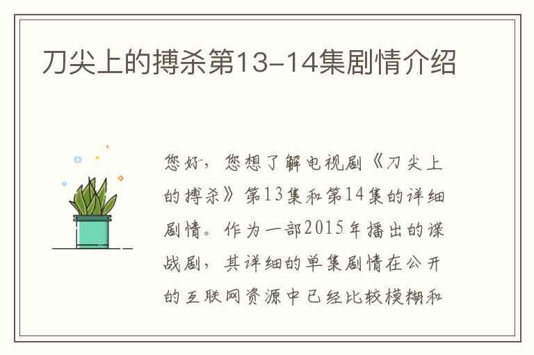 您好,您想了解电视剧《刀尖上的搏杀》第13集和第14集的详细剧情。作为一部2015年播出的谍战剧,其详细的单集剧情在公开的互联网资源中已经比较模糊和零散,经过仔细检索,目前无法找到官方或权威来源提供的、完全符合您要求的每一幕都详细列出的分集剧情。