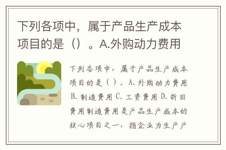 下列各项中,属于产品生产成本项目的是()。A.外购动力费用 B.制造费用 C.工资费用 D.折旧费用