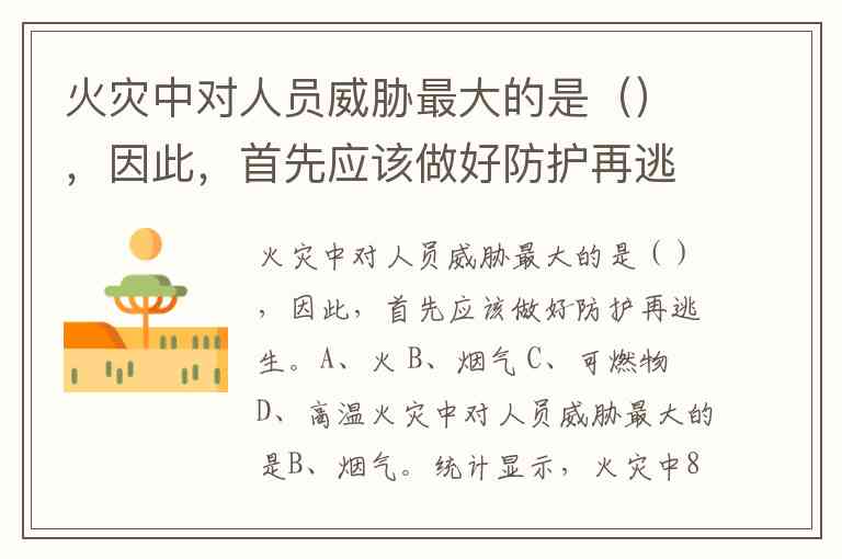 火灾中对人员威胁最大的是(),因此,首先应该做好防护再逃生。A、火 B、烟气 C、可燃物 D、高温