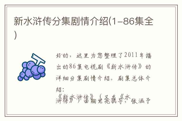 好的,这里为您整理了2011年播出的86集电视剧《新水浒传》的详细分集剧情介绍。