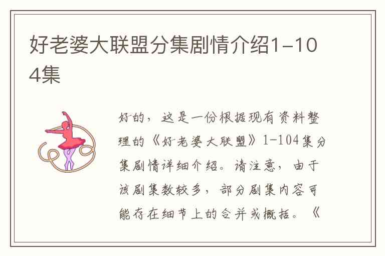 好的,这是一份根据现有资料整理的《好老婆大联盟》1-104集分集剧情详细介绍。请注意,由于该剧集数较多,部分剧集内容可能存在细节上的合并或概括。