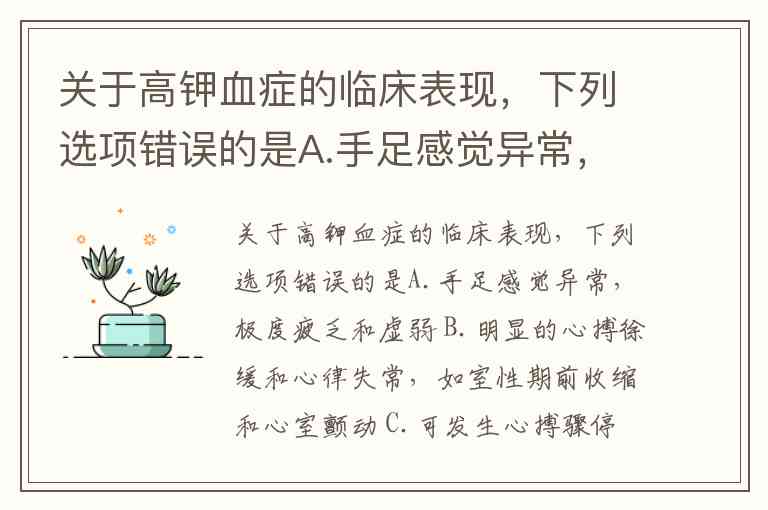 关于高钾血症的临床表现,下列选项错误的是A.手足感觉异常,极度疲乏和虚弱 B.明显的心搏徐缓和心律失常,如室性期前收缩和心室颤动 C.可发生心搏骤停 D.早期心电图T波低平,P波波幅上升,随后出现QRS变窄 E.动作迟钝、嗜睡、神志模糊