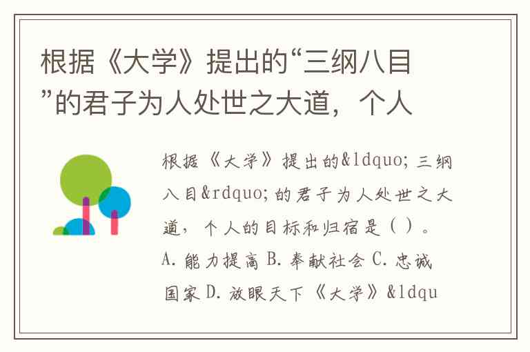 根据《大学》提出的“三纲八目”的君子为人处世之大道,个人的目标和归宿是()。A.能力提高 B.奉献社会 C.忠诚国家 D.放眼天下
