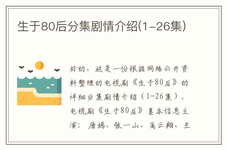 好的,这是一份根据网络公开资料整理的电视剧《生于80后》的详细分集剧情介绍(1-26集)。
